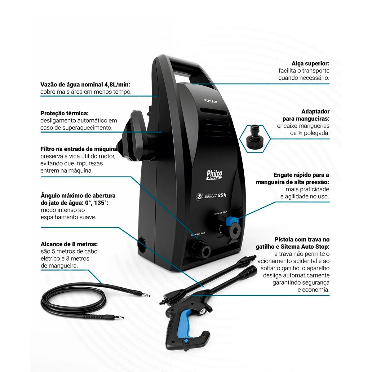 Além disso, o filtro na entrada permite o uso de água de reuso, ou seja, protege o motor e prolonga a vida útil da máquina. Com proteção térmica e alça para transporte, a Lavadora de Alta Pressão Philco Force PLP2800 1600W é a solução completa para quem busca eficiência e conveniência.